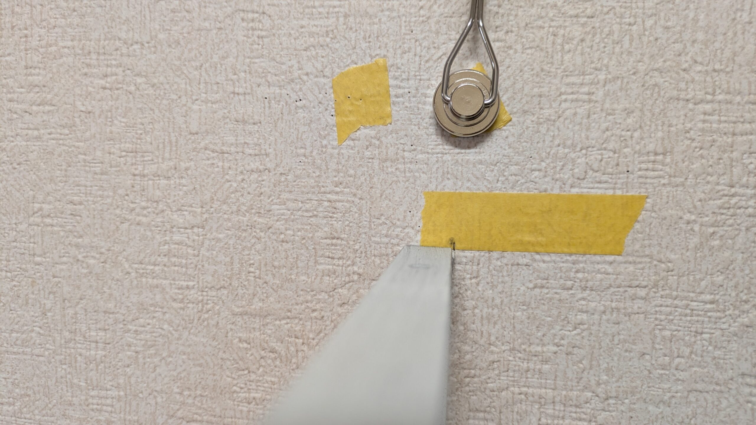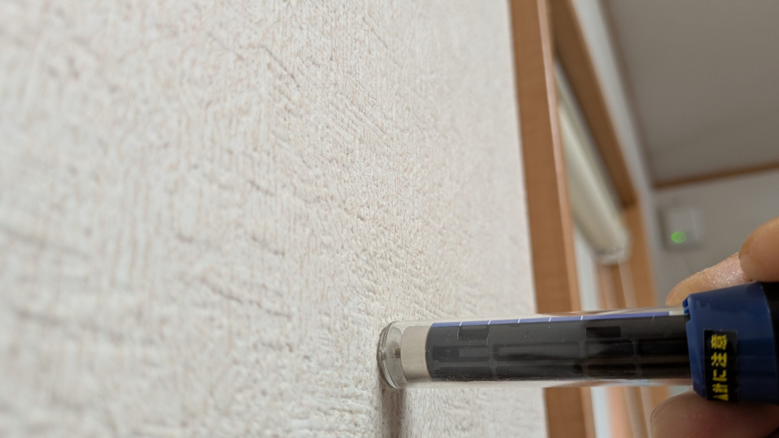 下地探し針を使って、壁の内部の間柱を探していきます。壁の下地は木材なので、そこにビスを留めることでしっかりと固定することができます。