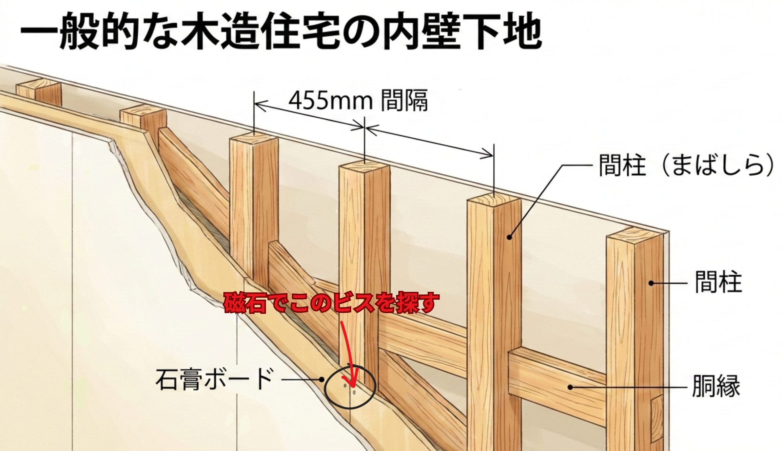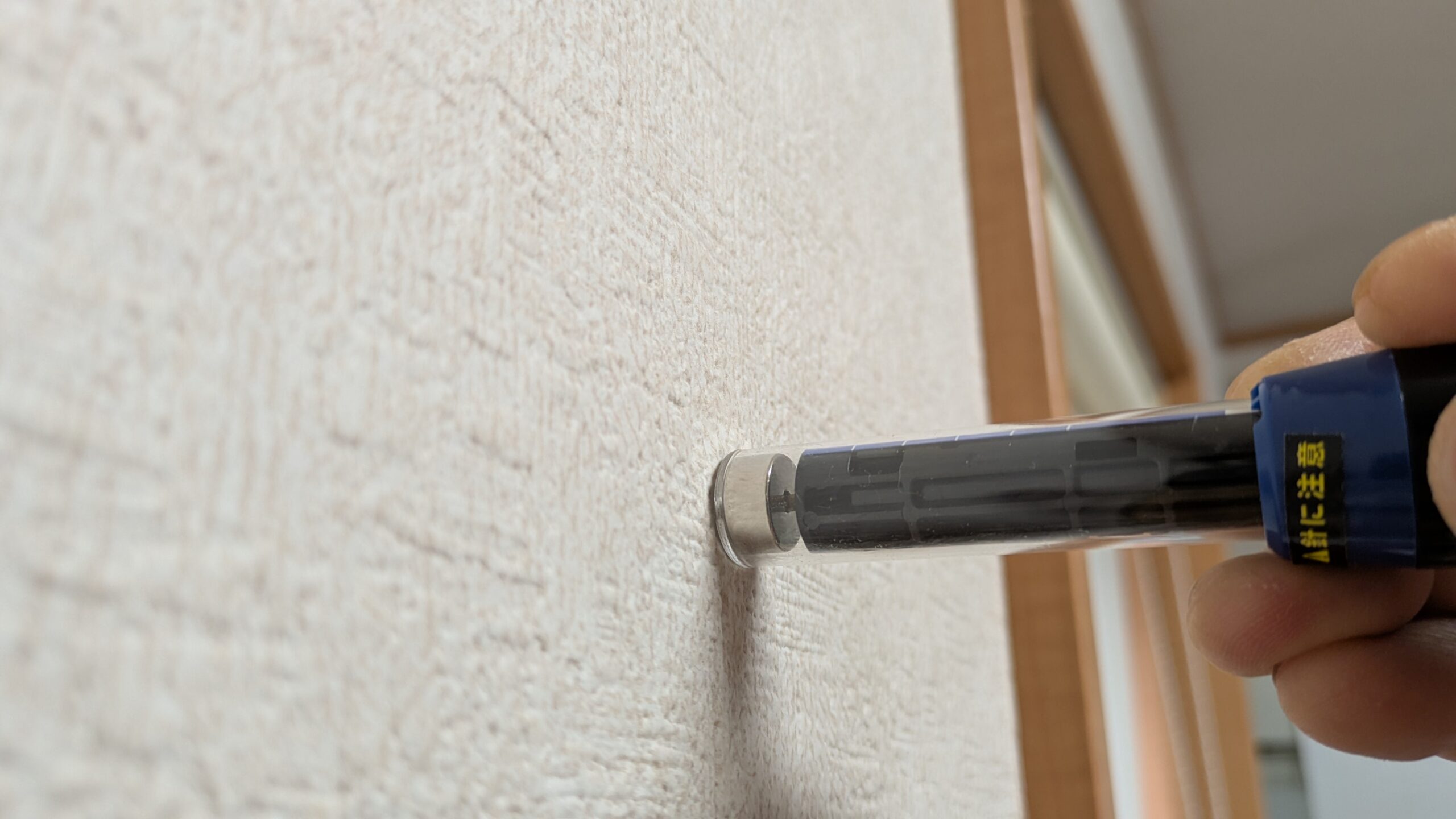 先端の磁石が壁側にピタッとくっつきます。ここにビスが留められていますので、間柱がこの位置にあるという事がわかります。