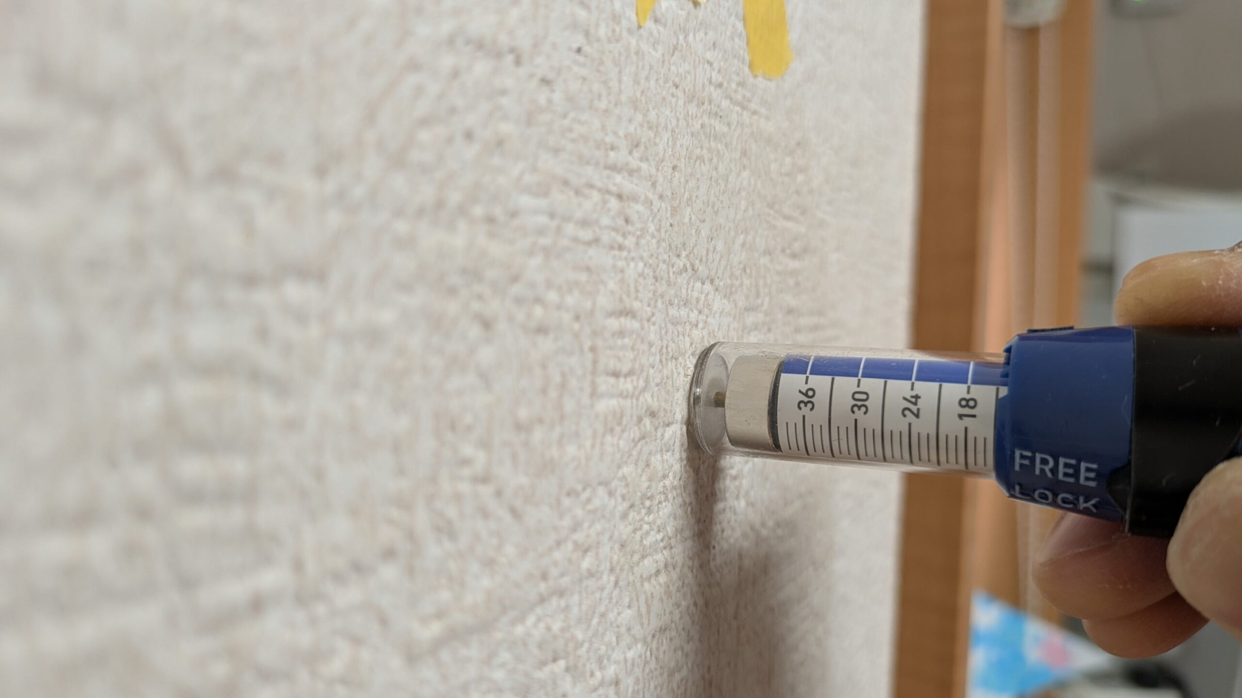 次は下地探し針の「針」を刺してみます。沈んだメモリを読むことで、間柱までの深さを測ります。間柱までの深さ15mmですね。これで、下地までの距離が15mmだということがわかりました。この作業をすることで必要なビスの長さを決めることができます。