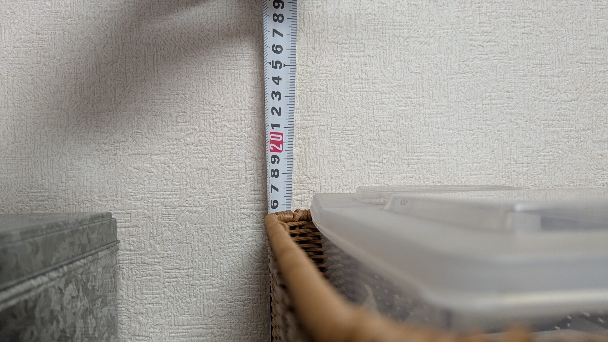 下の段にはお茶を収納しているカゴとボックスを置くので、「うーん…余裕を持って22cmくらいか(適当)」。これで位置が決まりました。