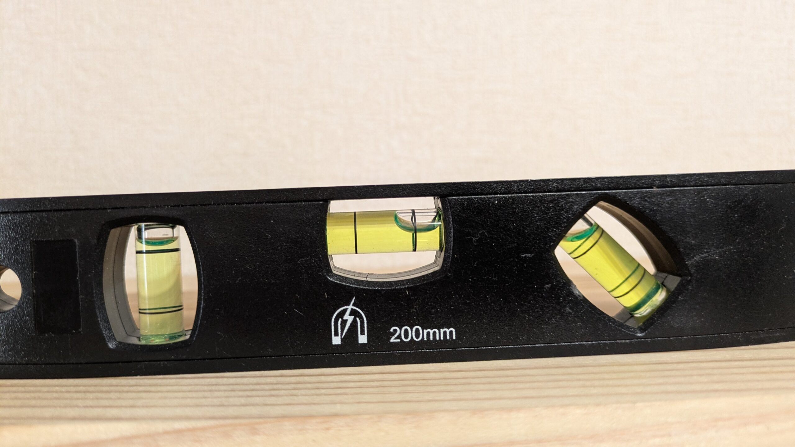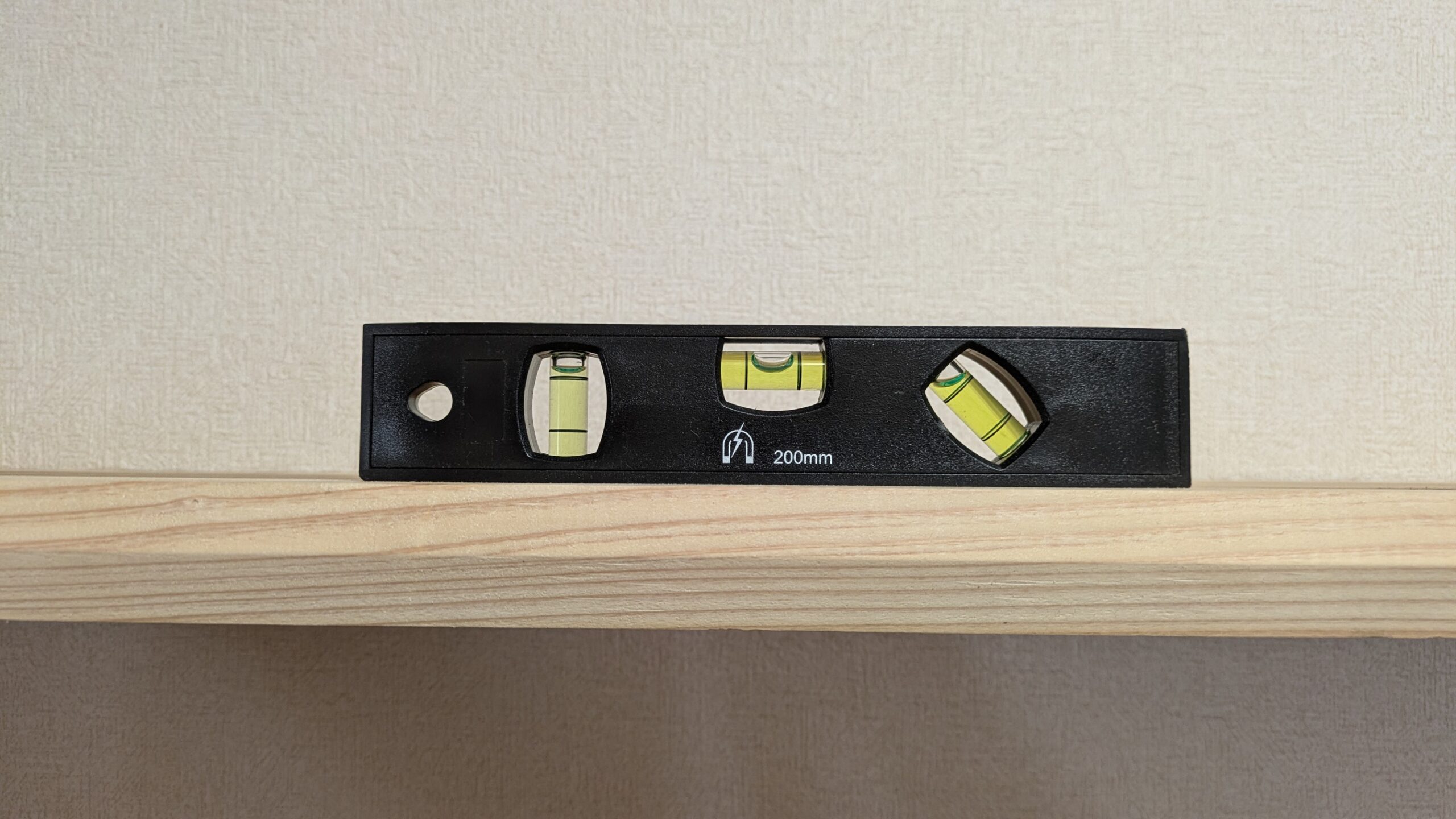 もう一つのポイントは棚板の水平を取る事。メジャーを使って細かく寸法を測る方法もありますが、水平器を使えば簡単に垂直・水平を取ることができます。