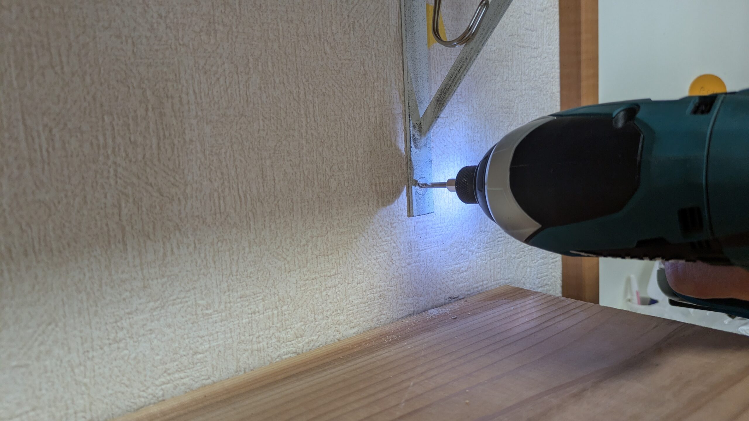 ポイントは下地を探してしっかりとビスで留める事。下地にビスを留めず石膏ボードに直接ビス留めしても、強度が足りず、最悪落下する危険性があります。