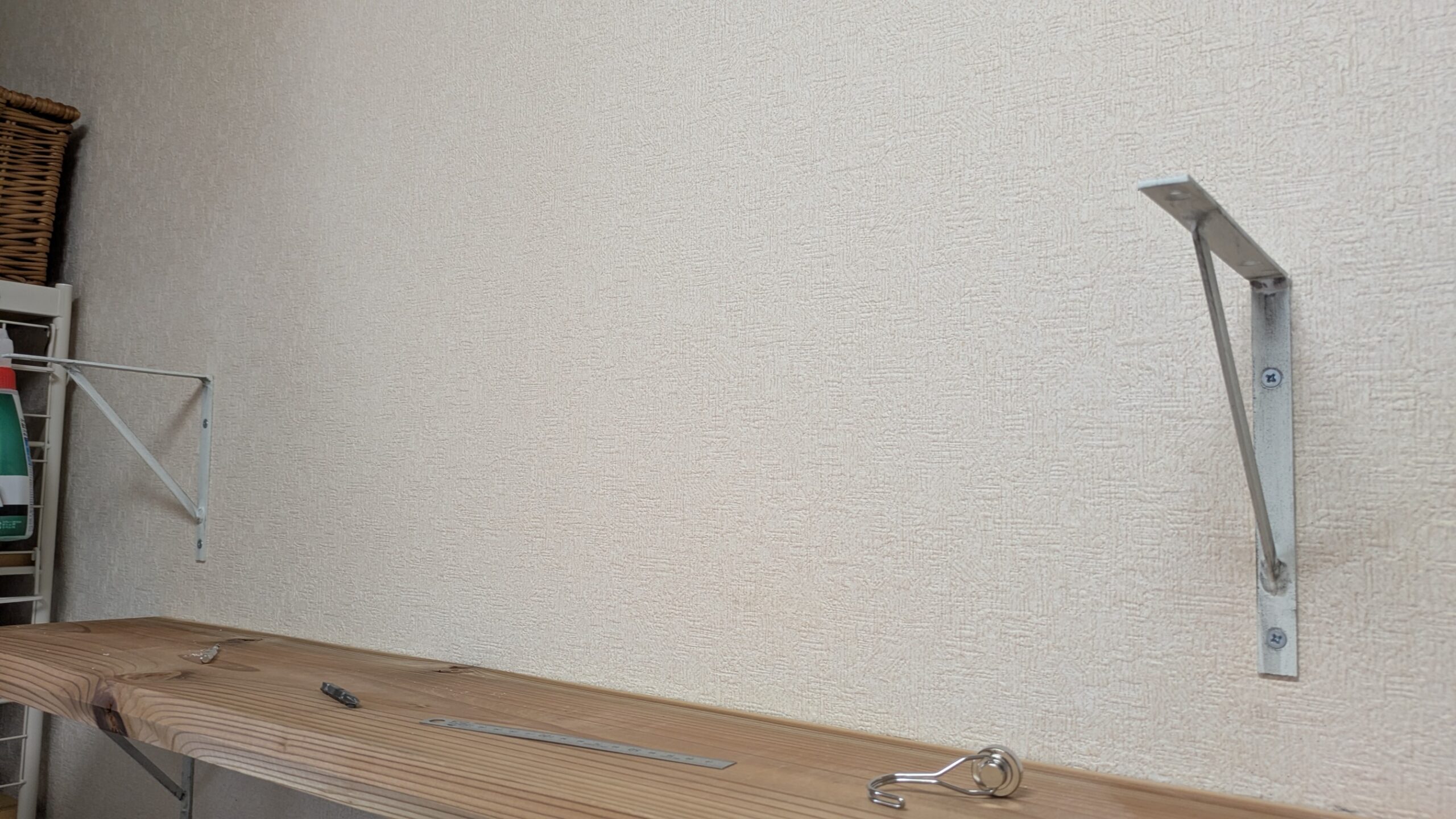 棚板を実際に壁に当てながら水平をとっていきます。ここで棚板が水平になる位置にもう片方のブラケットを設置します。