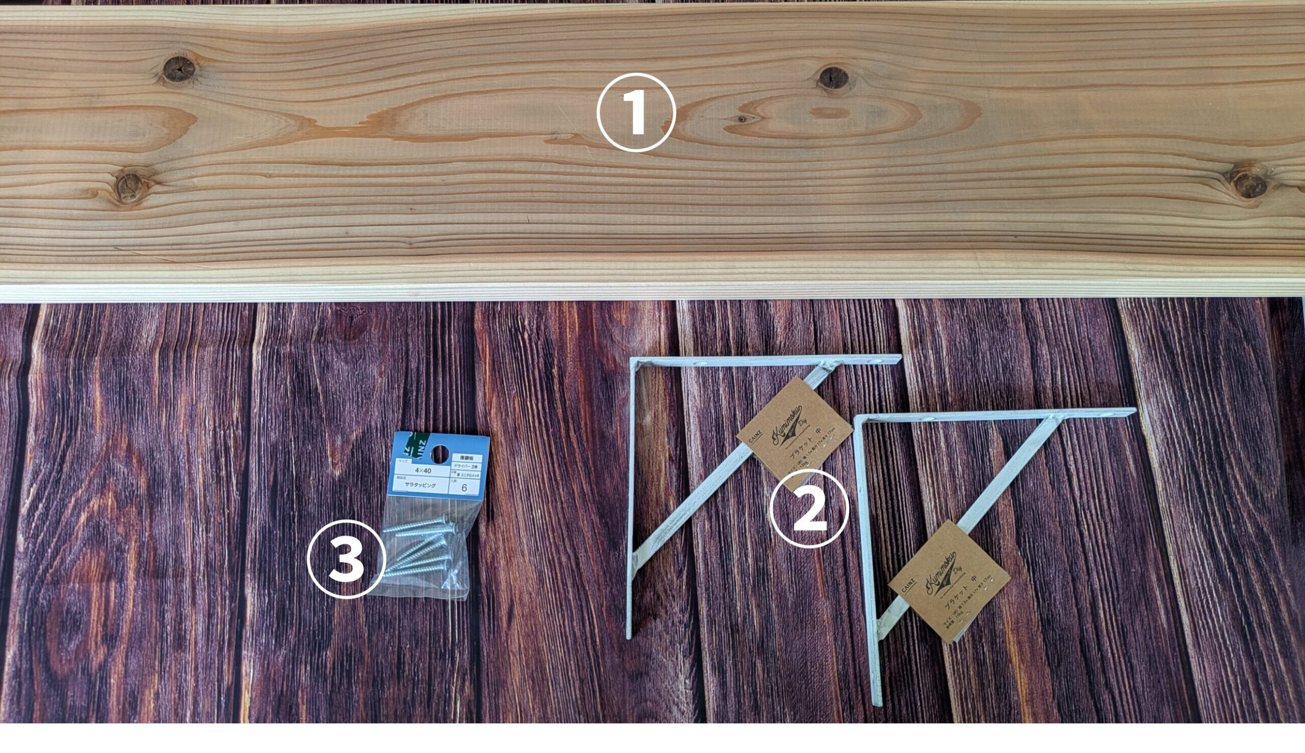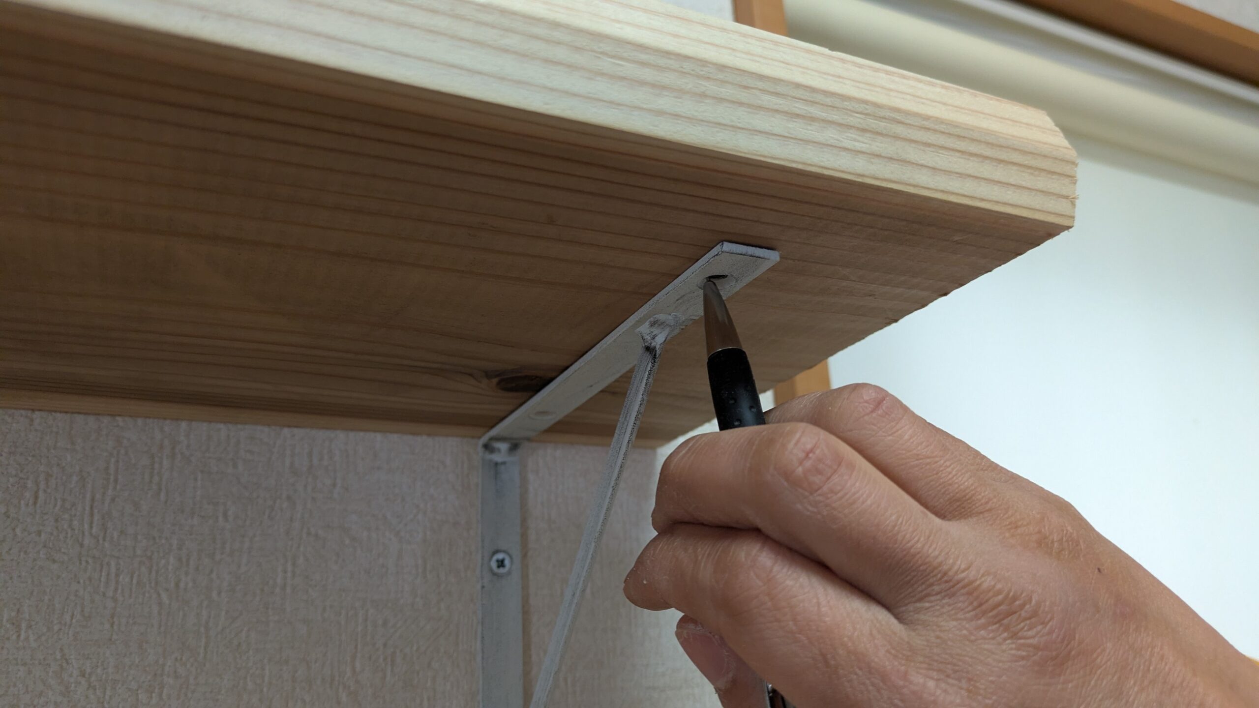 左右のバランスを考えながら棚板をブラケットの上に仮置きして、ビスを留める位置にペンなどで印をつけます。