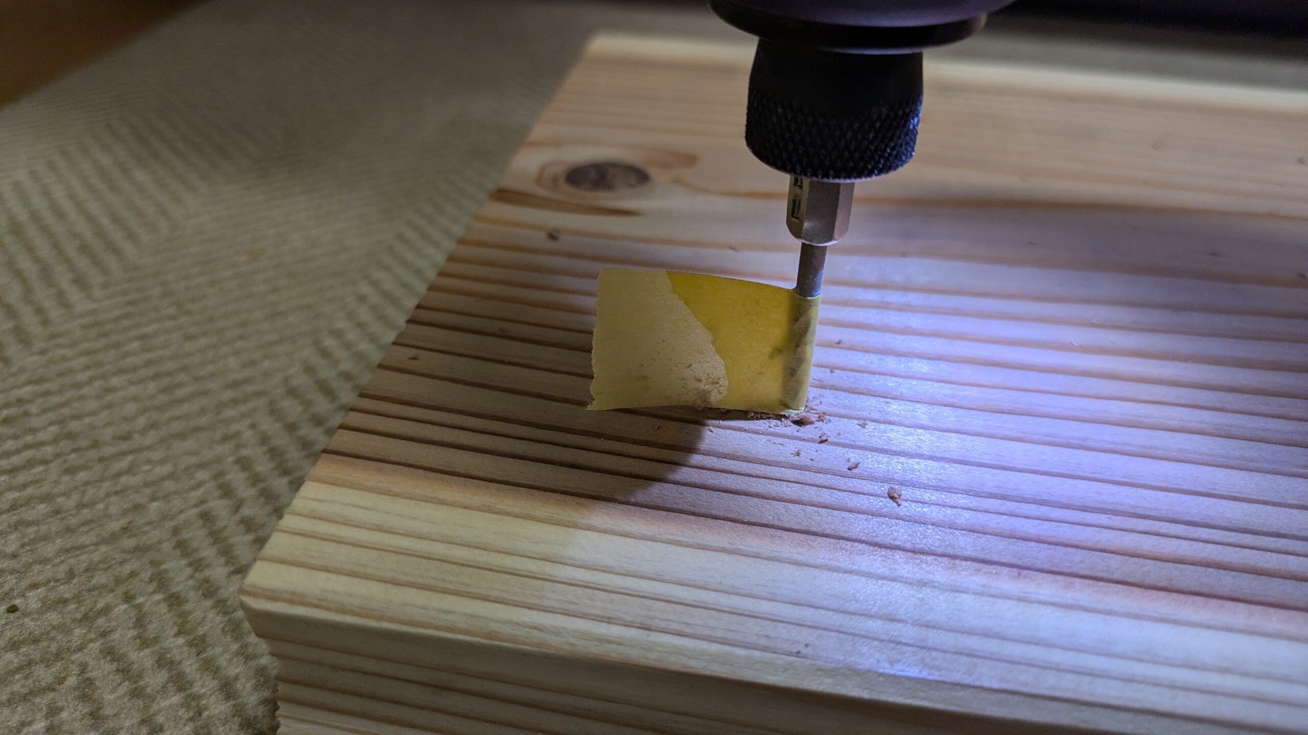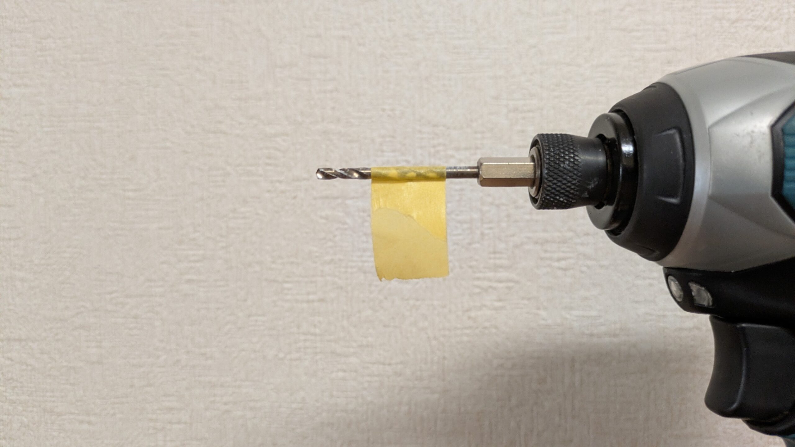 自信がない方はドリルビットにマスキングテープで目印をつけると、貫通するのを防げます。ビスの長さが16mmなので穴の深さはやや短い15mmで取っています。