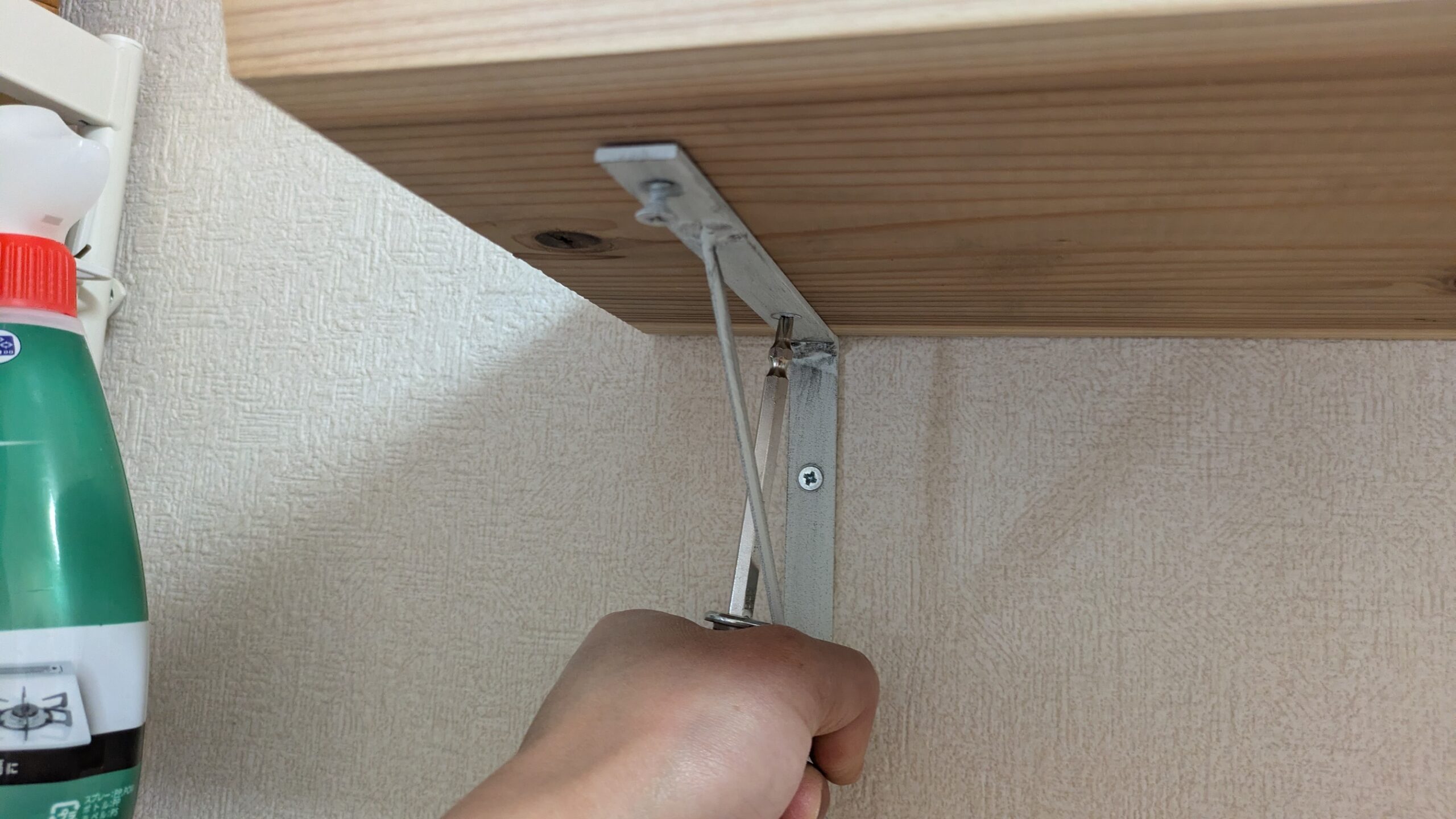 下穴を空け終わったらいよいよブラケットと棚板を結合します。完成間近です。