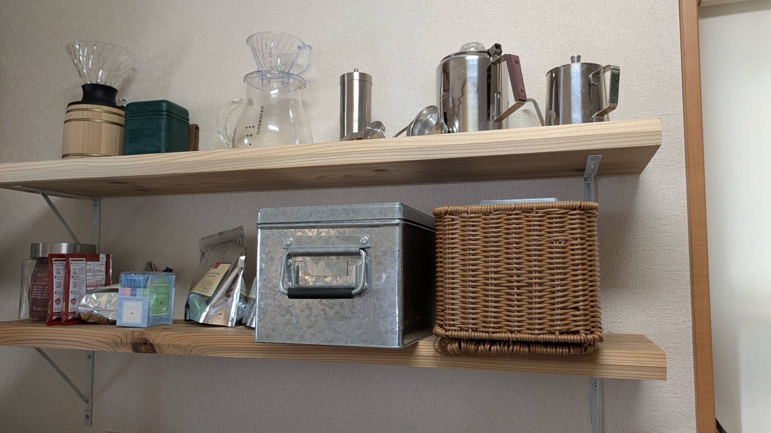 そこで、キッチンのデッドスペースに棚を作ろう!という事で、カフェにあるような棚を作ってコーヒー器具を無駄に飾っていきたいと思います。じつは数年前にキッチンのデッドスペースに棚を一段作っていまして、今回はその棚をまた一段増やしていく様子を紹介します。