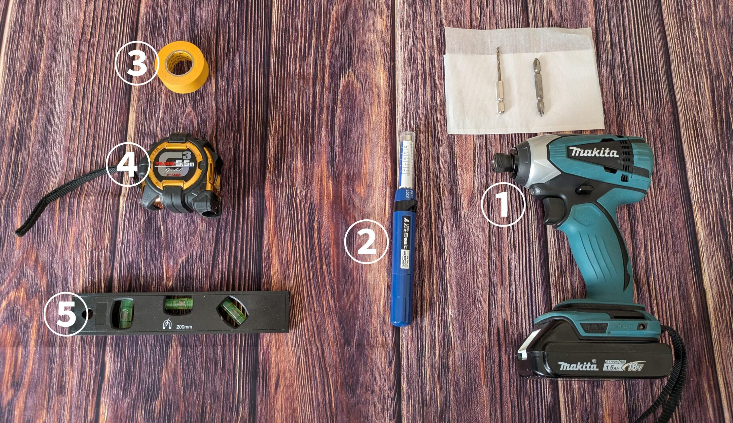 - 壁に目印をつけるのに使用する。鉛筆で直接目印を書いて消しゴムで消すでもOK。
