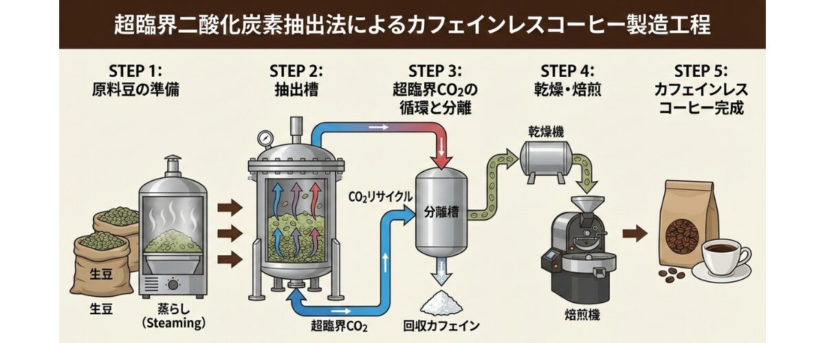 超臨界流体の二酸化炭素を使って、カフェインのみを抽出する方法です。