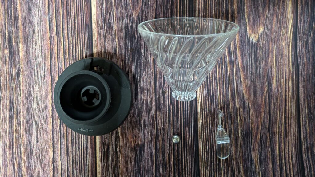 一見すると、HARIOの代名詞でもある円すい形の「V60ドリッパー」の下に、黒いシリコン製のベースが付いているだけのように見えます。しかし、このベース部分に最大の秘密が隠されています。