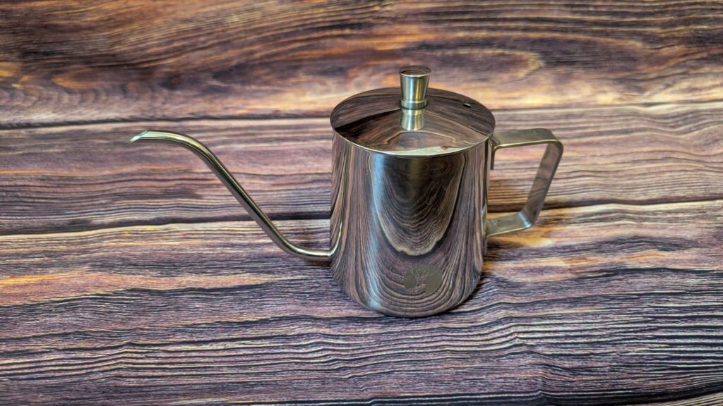 お湯を沸かすためのケトル。コーヒーのドリップ時に出すお湯の量を調整しやすいように口が細くなっている。