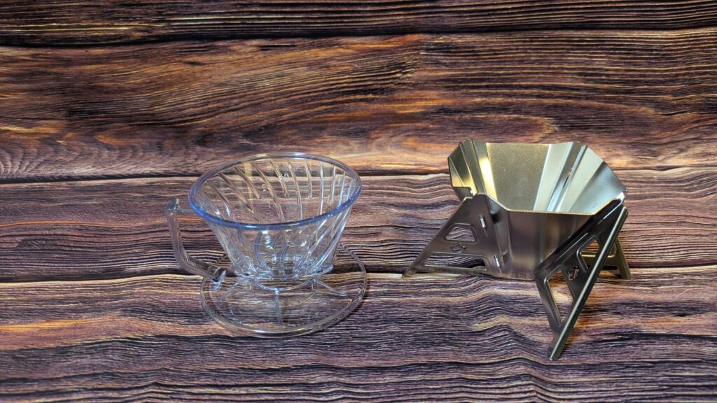 コーヒーをドリップする際にコーヒーフィルターをセットする台座。コーヒーマグの上にセットするので、サイズや安定性のチェックをしておくと良い。右は組み立て式のドリッパー。